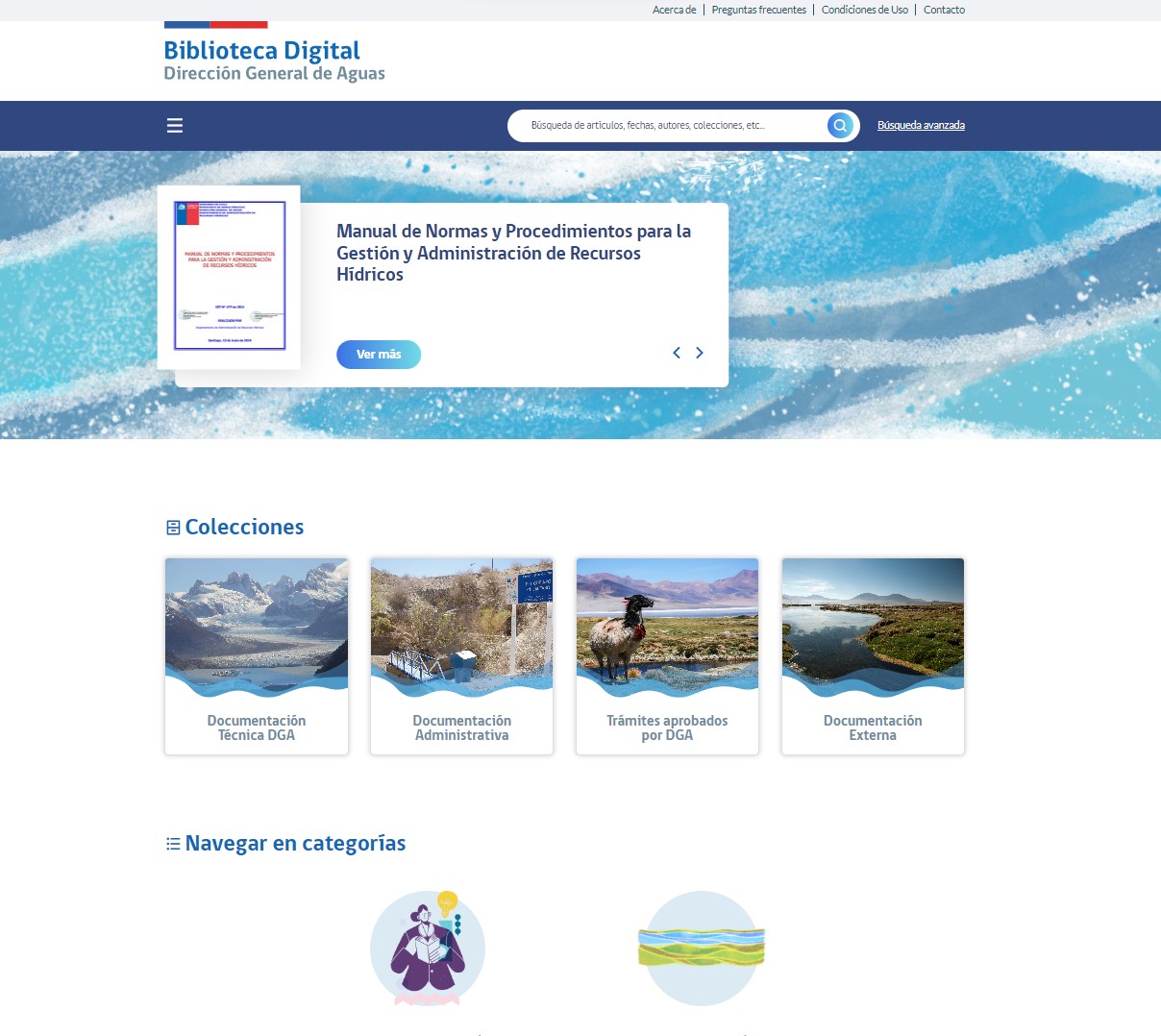 Además, el sitio de la biblioteca contiene la sección Navegar en categorías, con la categoría “Temas de interés” con tópicos como balance hídrico, planes estratégicos de gestión hídrica, inventarios, mapas hidroquímicos, catastros de usuarios de aguas, Atlas del Agua 2016 y gestión del agua. Y también la categoría “Cuencas hidrográficas”, con información hasta ahora sobre 23 cuencas.